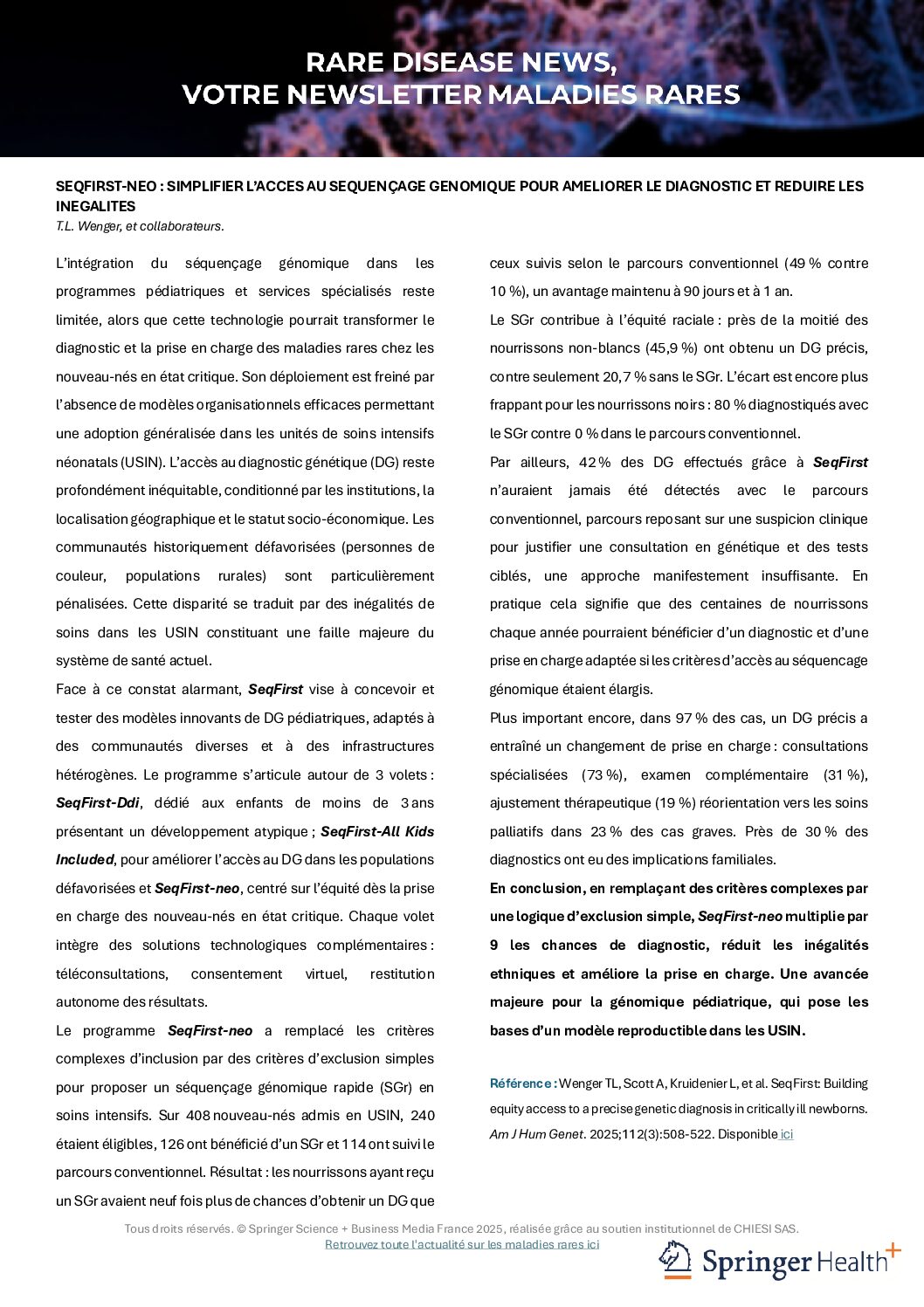 Référence : Boemer, F., Hovhannesyan, K., Piazzon, F. al. Population-based, first-tier genomic newborn screening in the maternity ward. Nat Med 31, 1339–1350 (2025).